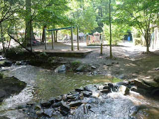 With rocky streams running through the whole park, the equipment is spread out in little pockets that our kids could discover in bits and pieces, as opposed to the phrenetic but brief enjoyment that most playgrounds offer.